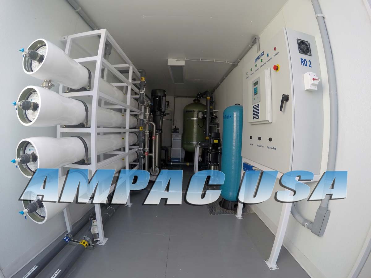AMPAC USA offers Emergency Mobile Water Purification Industrial Turnkey Brackish Water Reverse Osmosis 80,000 GPD | 12.6m3/hr. | BWRO80K-LX that are fully self-contained in Custom or Intermodal Connex Shipping Containers. These Heavy Duty Reverse Osmosis Plants are suitable for most water treatment applications using the following: Separation, Filtration, Ion Exchange, Carbon treatment, Anti-Scalant Chemical Injection, Ultrafiltration, Reverse Osmosis, Ultra Violet Disinfection, and pH Adjust.