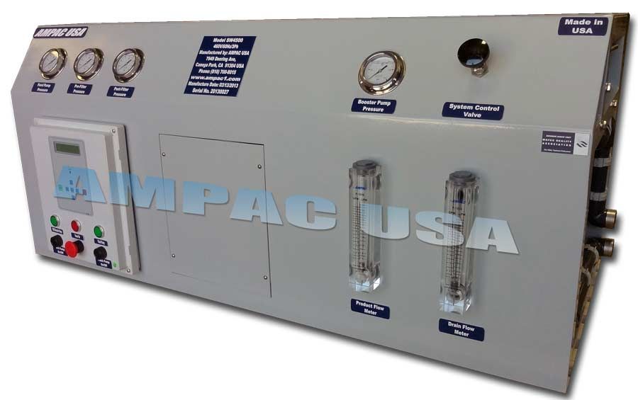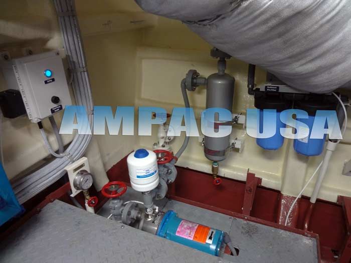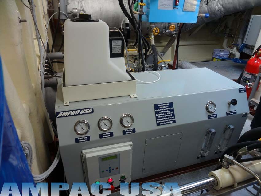 The Ampac SeaPro™ Sea Water Desalination Water Maker is the next generation Turnkey system designed for Commercial Marine and Navy Applications with internal High Pressure Booster Pump for ease of use in compact locations. Featuring a simple interface, the SeaPro Plus™ can be monitored via the control panel or the on-deck Remote Control. All components within the frame are readily accessible for easy maintenance.