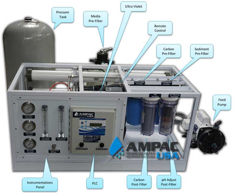 The Ampac SeaPro Plus™ Sea Water Desalination Water Maker is the next generation Turnkey system designed for Commercial Marine and Navy Applications with internal High Pressure Booster Pump for ease of use in compact locations. Featuring a simple interface, the SeaPro Plus™ can be monitored via the control panel or the on-deck Remote Control. All components within the frame are readily accessible for easy maintenance.