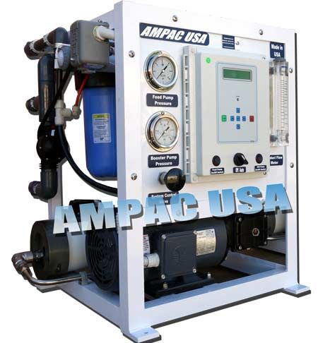 The Ampac SeaPro Plus™ Sea Water Desalination Water Maker is the next generation Turnkey system designed for Commercial Marine and Navy Applications with internal High Pressure Booster Pump for ease of use in compact locations. Featuring a simple interface, the SeaPro Plus™ can be monitored via the control panel or the on-deck Remote Control. All components within the frame are readily accessible for easy maintenance.