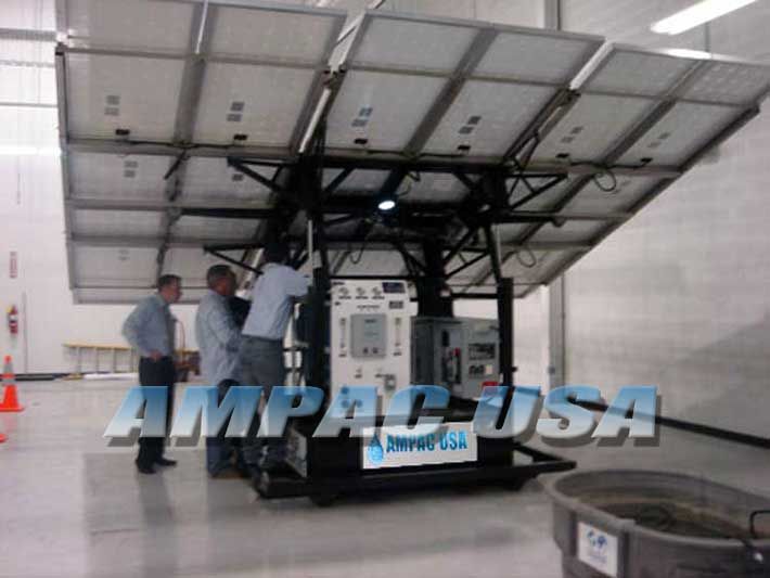This AMPAC USA ™ SLR- 18 - Mobile Solar Water Treatment is a solar-powered generator system with a built-in watermaker for seawater desalination process. Our Watermakers can handle 45,000 parts per million (PPM) of total dissolved solids per day.