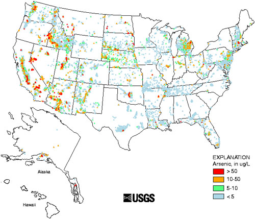 Arsenic is introduced into water through the dissolution of minerals and ores, Concentrations in groundwater in some areas are higher due to erosion from arsenic rich rocks, industrial effluents contribute to arsenic concentrations in some areas, as well as Combustion of fossil fuels is a source of arsenic in the environment through disperse atmospheric deposition. Finally, arsenic occurs in the environment in several forms, in natural waters it is mostly found as trivalent arsenite or pentavalent arsenate. Organic arsenic species, abundant in seafood, are very much less harmful to health, and are readily eliminated by the body.Drinking-water represent the highest threat to public health from arsenic. Exposure at work and mining and industrial emissions may also be significant.